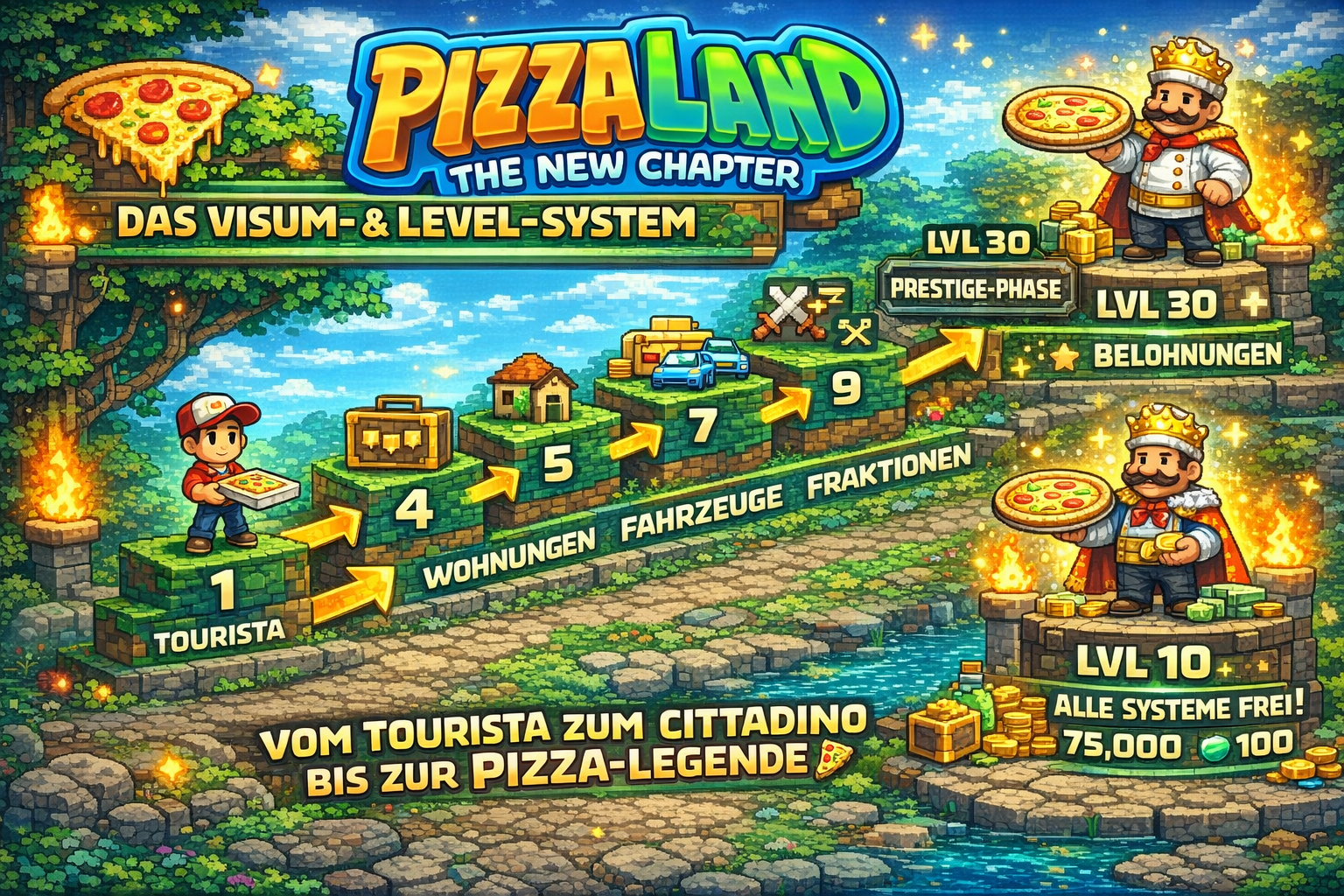 Mit PizzaLand 3.0 erhältst du ein neues Visum- und Level-System für einen fairen und strukturierten Start.